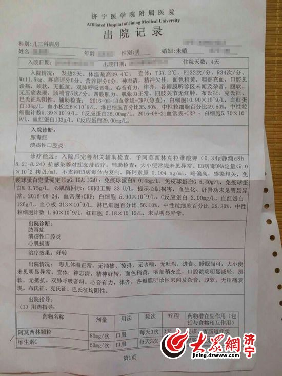 8月18日夜晚,15個(gè)月的張明明(化名)因高燒來到了濟(jì)醫(yī)附院急診就診,由于病情沒有好轉(zhuǎn),21號(hào)早上9點(diǎn)左右轉(zhuǎn)進(jìn)了兒三科病房進(jìn)行治療。