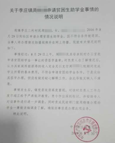 事情發生后,李莊鎮黨委政府高度重視,對視頻中的村負責人工作態度不端正給予嚴肅批評教育,責令作出深刻檢討,并安排專人對該事件進行進一步調查。同時,責成民政部門就村民周某某辦理助學金一事做詳細調查了解,確保實事求是辦理此項業務。