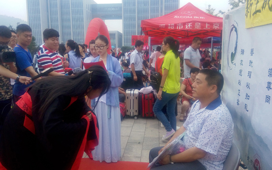 值得一提的是,在歷史與社會發展學院,這里的老生特意為新生準備了一場“新生成人禮”。他們為每名報到的新生穿上漢服、盤好發髻,然后雙手抬起,向家長鞠躬行禮。負責主持成人禮的學生告訴記者,為新生舉辦成人禮已經成了山師歷史與社會發展學院的一項傳統,“我們每年都會為報到的學弟學妹們準備這樣一個儀式,這也符合我們歷史學院的氣質。”