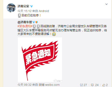 據濟南市車管所官微回應,今天下班前網絡無法恢復。