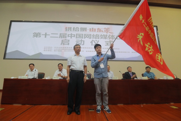 啟動儀式上,中共山東省委宣傳部副部長、山東省互聯網信息辦公室主任李建軍為采訪團授旗,采訪團成員代表人民網記者付長超接旗,“供給側·山東策——第十二屆中國網絡媒體山東行”大型采訪活動正式啟動。