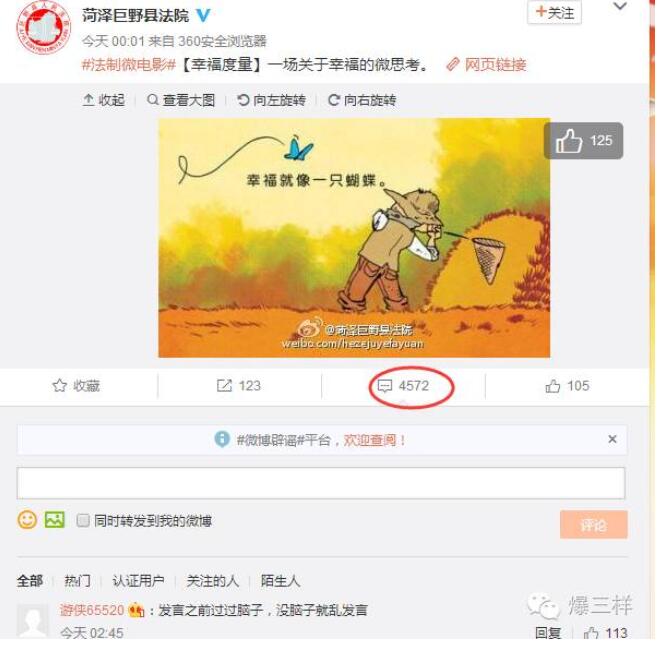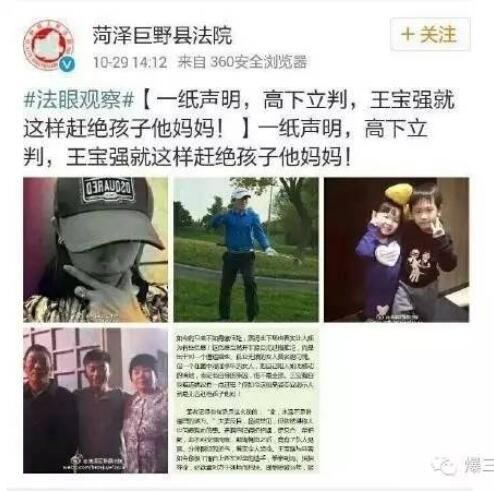 從這張網上熱傳的微博截圖中,爆三樣(ID:sdbaosanyang)的樣妹驚訝地發現,一個疑似菏澤巨野縣人民法院官微的賬號公開發聲稱,“王寶強就這樣趕絕孩子他媽媽”,并在配圖中對馬蓉這樣一個“遭遇婚變、孤立無援”的女人表示同情。雖然樣妹隨后在巨野法院官微上并沒找到這條微博。但今天凌晨,巨野法院官微最新的一條微博,截至發稿時,卻已遭到了4500余條網友評論圍攻。對于明星婚變,倘若有法院這樣公開站出來喊話合適嗎?面對眾多網友微博評論追問,巨野縣法院尚未就此事作出正面回應。