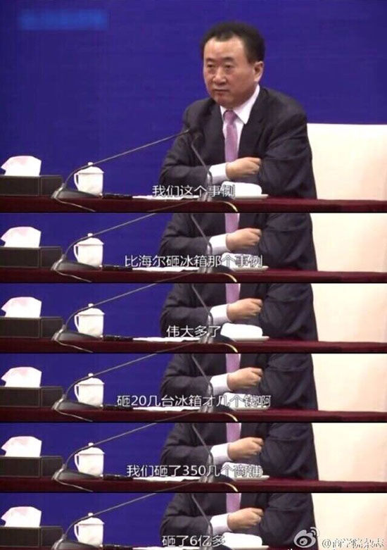 近日,王健林在萬達學院開學典禮的內部會議上談及企業誠信一事,用萬達太原街賠付事件對比當年海爾張瑞敏砸冰箱的典型案例,評價稱“我們這個事例,比海爾砸冰箱那個事例偉大多了。砸20幾臺冰箱才幾個錢啊,我們砸了350幾個商鋪,砸了6億多。這個而且賠的不是6億多,是賠10億多。”