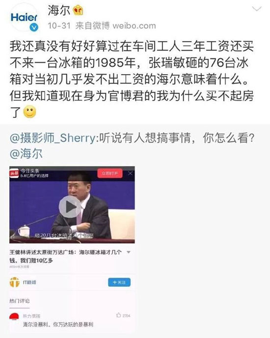 對此,海爾官方微博進行了回應:“我還真沒有好好算過在車間工人三年工資還買不來一臺冰箱的1985年,張瑞敏砸的76臺冰箱對當初幾乎發不出工資的海爾意味著什么。但我知道現在身為官博君的我為什么買不起房了。”