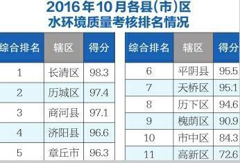 10月份,按照國家《地表水環境質量標準》中五類標準(主要污染物COD(即化學需氧量)≤40毫克/升,氨氮≤2毫克/升),全市61個斷面中有34個斷面達標,占55.7%,比上月增加1個。長清、濟陽和商河考核斷面全部達標,其他7個縣(市)區和高新區存在劣五類水質斷面,其中章丘市1個,斷面達標率為75.0%;歷城區4個,斷面達標率為69.2%;槐蔭區3個,斷面達標率為57.1%;平陰縣2個,斷面達標率為50.0%;歷下區4個,斷面達標率為33.3%;天橋區5個,斷面達標率為33.3%;市中區5個,斷面達標率為28.6%;高新區3個,斷面達標率為0%。