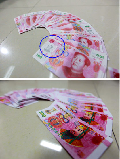 犯罪嫌疑人用來(lái)行騙的冥幣,大小、花色與人民幣極為相似,只有個(gè)別細(xì)節(jié)略有不同。