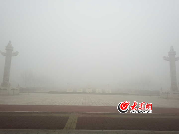 臨沂霧霾嚴重,上圖中左前方的臨沂沂河消失在濃霧中。