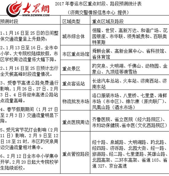 大眾網(wǎng)濟南1月12日訊 今年春運自明天(13日)開始到2月21日歷時40天,道路客運高峰將比往年來得早、時間長、峰值高。為此,濟南交警支隊發(fā)布了春運出行預(yù)警,發(fā)布了春節(jié)期間市區(qū)40多處容易擁堵的商圈、客運場站、景區(qū)、物流中心、主干道,并預(yù)測下午及傍晚時段14-19時交通事故集中,高速公路出行建議避開京臺高速黃河二橋至殷家林立交段等7處易堵路段。