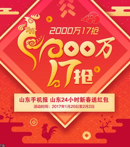 大眾網1月19日訊(記者 曲欣萍)2000萬紅包“17”搶!春節將至,大眾網聯合滴滴出行、大眾海藍電商,重磅送出總價值2000萬元的紅包大禮。活動時間從1月20日持續至2月2日(臘月廿三到正月初六),每天高達10萬個,搶到你手軟!