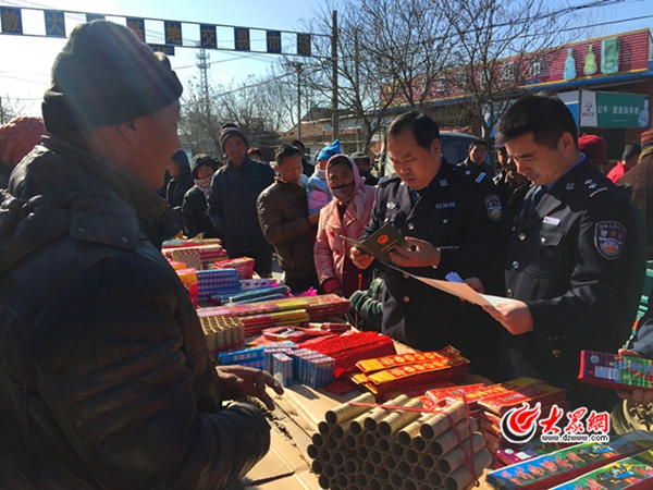 楊兵(右一)和同事一起檢查大集上的煙花爆竹情況。