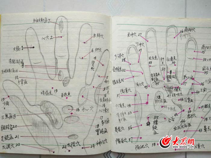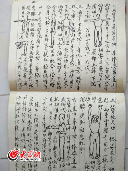 王老雖然已經85歲高齡,但身體十分硬朗,這完全得益于他日常的自我保健。王老自創了一套健康操,他現場手把手地教給記者。他將這套操手繪畫成了繪本,準備無償傳授給年輕人。他說:“希望你們在工作的同時,一定不要忘記身體的鍛煉。”