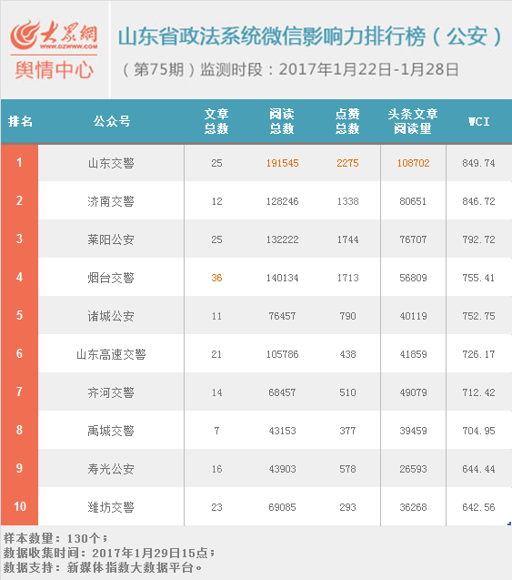 大眾網(wǎng)濟(jì)南2月4日訊 山東政法系統(tǒng)微信影響力排行榜本周發(fā)布第七十五期。公安榜單中“山東交警”奪冠,“濰坊交警”分享的安全返程攻略獲得兩萬(wàn)余人關(guān)注,成為全榜最熱文章。“山東省人民檢察院”毫無(wú)懸念拿下檢察院榜單冠軍。“威海市環(huán)翠區(qū)人民檢察院”潛力迸發(fā),進(jìn)步133名。“山東高法”在法院榜單中排名第一。