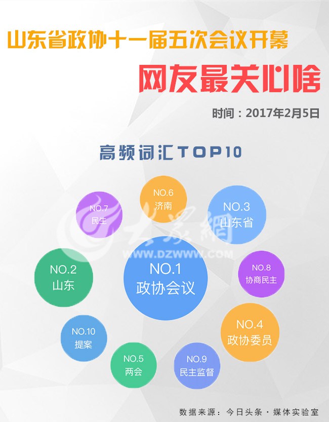 2017年山東省兩會期間,大眾網與今日頭條媒體實驗室聯合發布“高頻詞匯TOP10”和“最熱新聞”,通過媒體實驗室大數據,分析網民關注熱點,敬請關注。