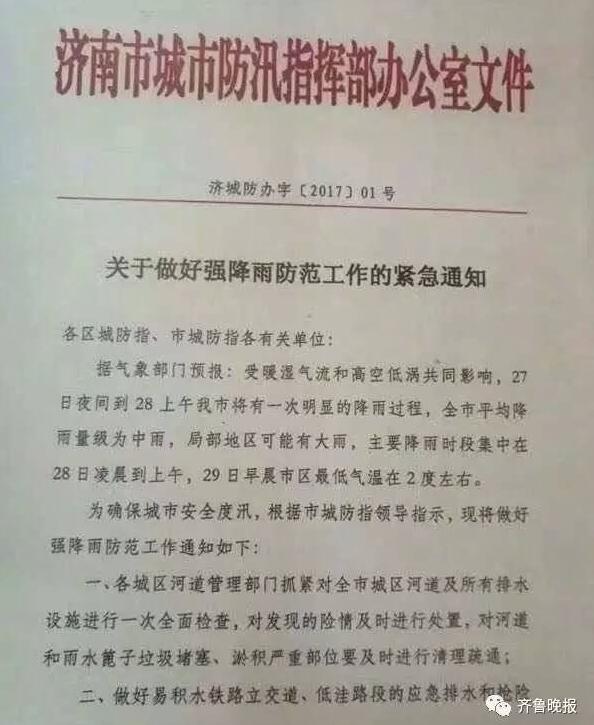 為應(yīng)對(duì)27日夜間、28日上午降水濟(jì)南城市防汛部門下發(fā)緊急通知