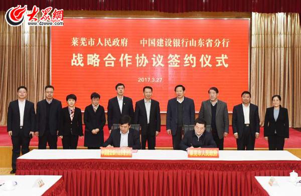 萊蕪市委常委、常務副市長孟令興與建行山東省分行黨委委員劉春龍簽訂了《萊蕪市人民政府、中國建設銀行山東省分行戰略合作協議》。建行山東省分行為萊蕪市新增授信100億元,新增的融資將用于十大產業和基礎設施等領域,全力支持萊蕪實體經濟發展。重點支持重點產業、基礎設施建設及民生工程(其中支持實體經濟領域占比達到60%以上),雙方將在濟萊城際鐵路、棚改、公鐵立交、北部新城、全域旅游、特色小鎮等項目上加強合作。