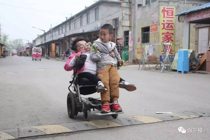 在幼兒園門口,見到媽媽,虎子開心地奔跑過來。回去的路上,像其他媽媽用車子帶著孩子一樣,宋冰心用輪椅載著兒子回家。只見,她緊緊拽著虎子的身子,側(cè)頭看著路,小心地控制著輪椅方向。