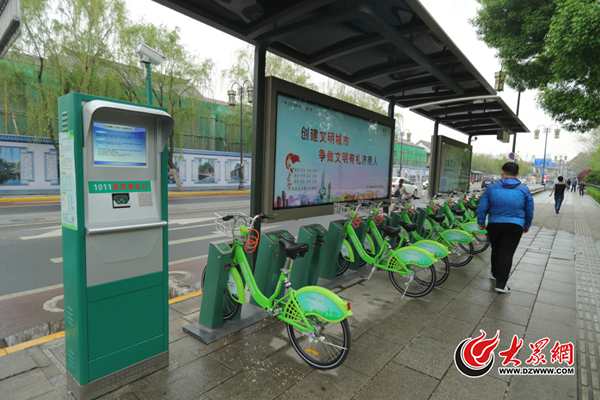 4月19日,在濟南歷下區公共自行車的皇亭體育館站點,大量“小綠車”閑置。