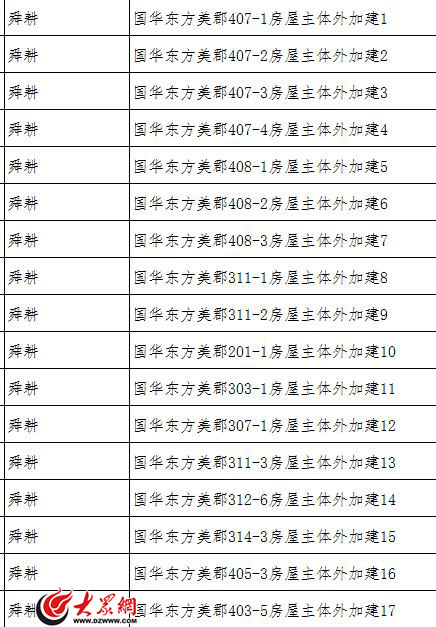 大眾網記者注意到,在這次公布的違法建設拆除臺賬中,國華東方美郡有17處主體外加建上榜,另外,芙蓉街的10處板房,泉樂坊的圓緣園、BUFF酒吧違建以及南部山區的多處農家樂違規建筑也在這次拆除之列。(大眾網-山東24小時記者 賀輝)
