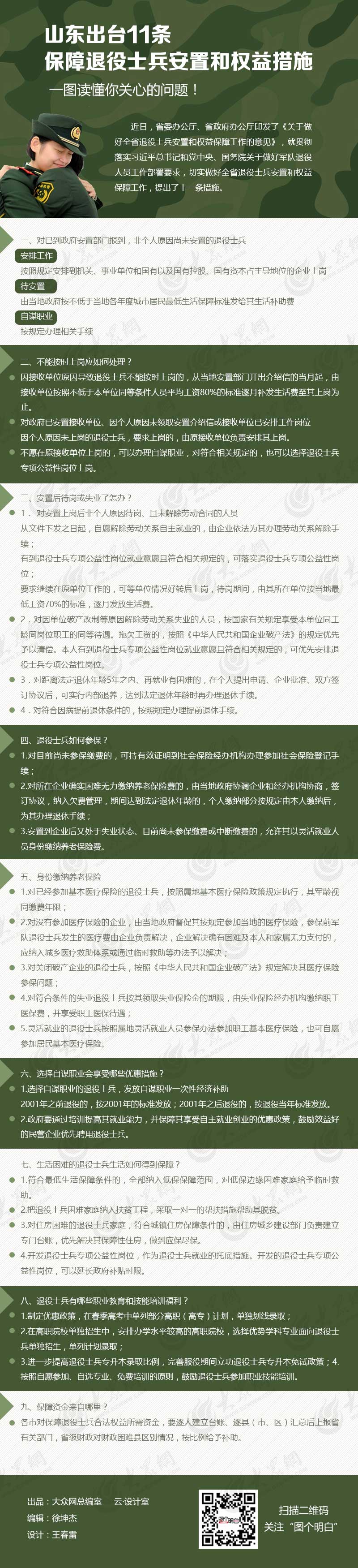 大眾網5月8日訊 近日,省委辦公廳、省政府辦公廳印發了《關于做好全省退役士兵安置和權益保障工作的意見》,就貫徹落實習近平總書記和黨中央、國務院關于做好軍隊退役人員工作部署要求,切實做好全省退役士兵安置和權益保障工作,提出了十一條措施。