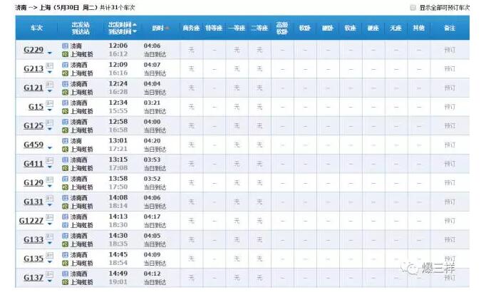 爆三樣從12306網站查詢發現,截止今天下午1點時,5月30日從濟南開往北京的車次中,中午12點之后發車的高鐵車票僅剩十幾張,快速列車僅剩少量硬座車票。