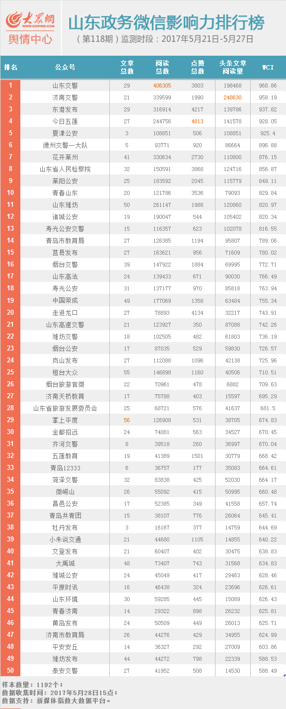 大眾網濟南6月1日訊 山東政務微信影響力排行榜本周發布第118期。本期榜單三甲并未易主,仍然為“山東交警”、“濟南交警”、“東港發布”。夏津公安憑借《關于城區華夏A區案件信息的情況說明》等文章躍升56名,成為本期黑馬。9個賬號進步30個名次以上。“山東省人民檢察院”更新的《山東省人民檢察院公布于歡案處警民警調查結果》一文占領榜單頭條,閱讀量突破十萬。