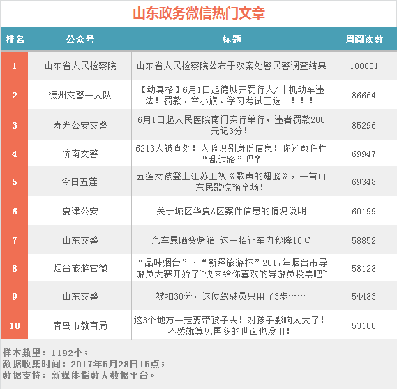 “山東省人民檢察院”更新的《山東省人民檢察院公布于歡案處警民警調查結果》一文占領榜單頭條,于歡故意傷害案受到社會廣泛關注,而處警民警是否構成玩忽職守罪是輿論關注的焦點之一,因此該文推出后閱讀量迅速突破十萬。“德州交警一大隊”和“壽光公安交警”發布的交通規則及違章處罰的文章占據榜單二、三名。濟南交警更新《6213人被查處!人臉識別身份信息!你還敢任性“亂過路”嗎?》一文,對亂過路行人進行曝光,經過一段時間的整治,小編感覺亂過馬路的行人確實少了很多,給警察蜀黍點贊!