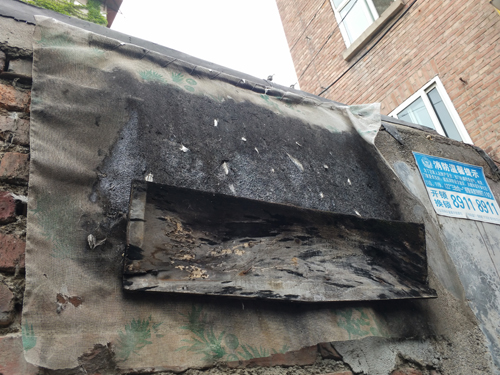 臨近11號樓搭建鴿籠一側的住戶院墻上粘滿羽毛的紗窗