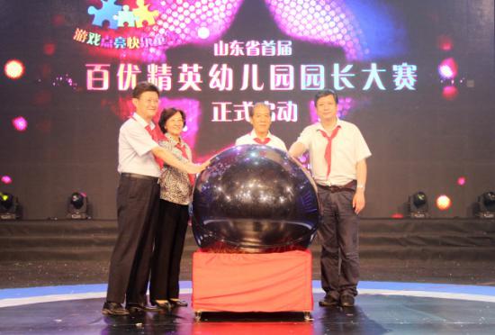 省委原副書記、省人大常委會原黨組書記、常務副主任、省關工委主任高新亭;省政協原副主席、省關工委常務副主任趙玉蘭;省教育廳副巡視員張士俊;山東廣播電視臺黨委書記、臺長呂芃,一起啟動山東省首屆百優精英幼兒園園長大賽。
