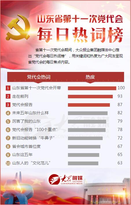 我省第十一次黨代會開幕的消息,受到了中央級媒體、省級媒體及各地市媒體的高度關(guān)注和集中報道,“山東省第十一次黨代會開幕”成為今日排名首位的熱詞。