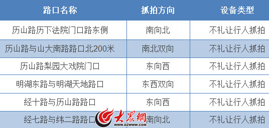 近日濟南新增的6處不禮讓行人抓拍點位分別為:歷山路歷下法院門口路東、歷山路山大南路路口北200米、歷山路梨園大戲院門口、明湖東路與明湖天地路口、經十路歷山路路口、經七緯二路口。此前已啟用的4處不禮讓抓拍分別位于104國道力明學院路口、山大南路山東大學中心校區南門、濼源大街趵突泉南門、歷山路歷山名郡東門。