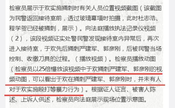 同時,一份來自派出所警察執法記錄儀的視頻也顯示,于歡持刀捅了兩名討債者時,并沒有遭到他人的毆打。