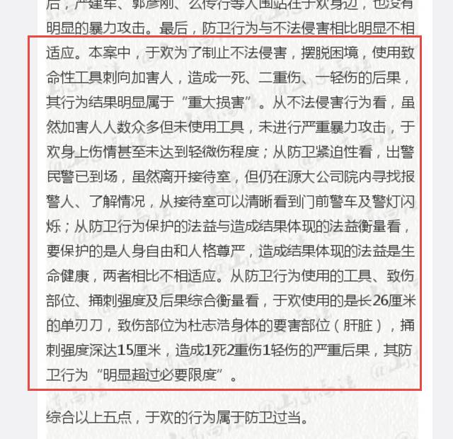 檢察院進一步解釋說,雖然于歡和母親確實被限制人身自由,人格遭到侮辱,但在警察到來前后,都沒有遭到任何會威脅到生命權的嚴重侵害,身體健康權僅遭到輕微暴力侵害,所以并不具備實施“特殊防衛”(或無限防衛)的前提。