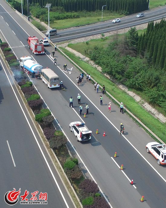 大眾網濟南6月27日訊 今天上午9點,濟南東繞城高速上一輛中巴車與一輛罐車相撞并“起火”,齊魯交發信息監控中心通過視頻巡檢發現后立即啟動應急處置預案,向交警、路政、救援、消防和醫療救助等單位通報。這是齊魯交發、濟南交警、市公路局、濟南消防支隊、急救中心等部門展開的一場交通事故應急處置演練。上述部門接到警情后迅速到達現場,并按照職責分為事故現場處置、交通分流、應急救援等6個工作組,根據預案對現場進行了應急處置。這次演練中,濟南高速交警出動了警用無人機進行現場勘查,協助指揮部進行現場處置指揮。(大眾網-山東24小時記者 賀輝)