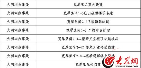 在這次公布的違法建設拆除臺賬中,寬厚里有8處板房加樓頂違建上榜;另外,山大洪家樓校區的31處磚混違建以及南部山區的數十處農家樂違規建筑也在這次拆除之列。