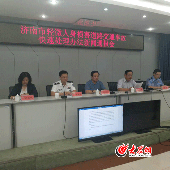 大眾網濟南7月7日訊 今天上午,濟南市交警支隊召開了“濟南市輕微人身損害道路交通事故快速處理辦法”新聞通報會,對《濟南市輕微人身損害道路交通事故快速處理辦法(試行)》(以下簡稱《辦法》)的相關條例及負責處理輕微人身損害交通事故保險理賠工作的快處聯合辦公室的人員設置與職責,和理賠工作的流程做了相關通報。