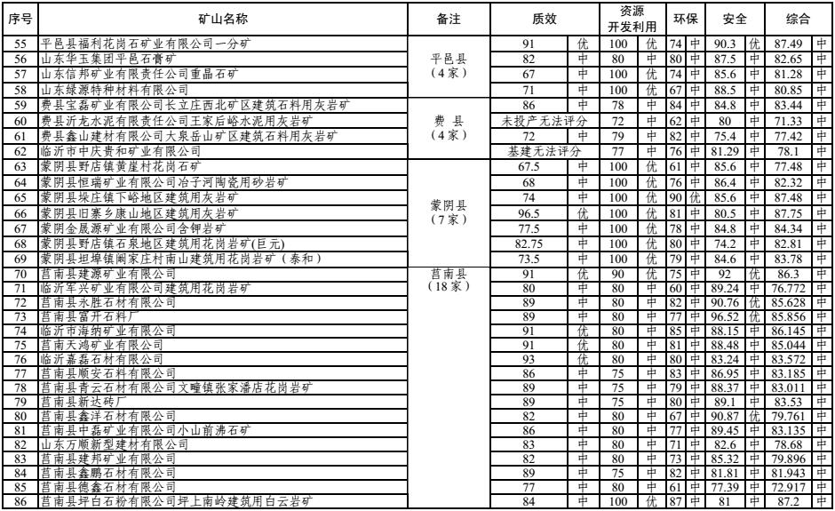 據了解,臨沂市礦山轉型辦組織市經信委、市國土資源局、市環保局、市安監局,對各縣區上報的質量效益、礦產資源開發利用、環境保護、安全生產單項評級初評結果進行了審查把關,并對各單項評級進行總評打分。其中,安全生產評級得分、環境保護評級得分所占權重為 30%,礦產資源節約集約利用和質量效益方面評價得分所占權重為 20%。總評類別分為優、中、差三個等次。總評得分“90-100”分,總評類別為“優”;總評得分“60-89”分,評類別為“中”;總評得分為“0-59”分,評類別為“差”。同時,安全生產、環境保護、礦產資源節約集約利用和質量效益有一項評級為“差”的,總評類別即為“差”。截至目前,臨沂市綜合評級共完成180 家,其中“優”21 家,“中”96 家,“差”63 家。
