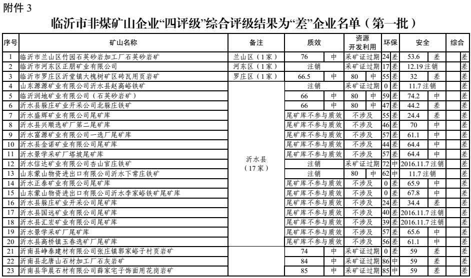 大眾網濟南7月13日訊 13日,經過近乎嚴苛綜合評級,臨沂市安委辦對外公布了第一批180 家非煤礦山企業名單。其中獲得“優評”的企業有21 家,“中評”96 家,“差評”63 家。據大眾網記者了解,此次獲得“差評”的企業,如果整改不到位,將被責令關閉淘汰;而獲得“優評”的企業,則會被列入“發展壯大一批”名單,給予重點扶持。