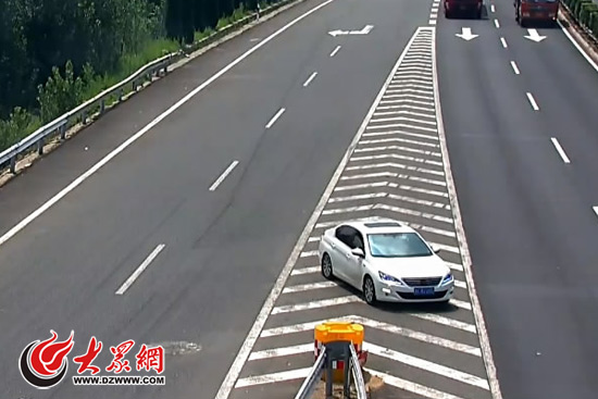 在應急車道違法停車處理完后,這輛轎車騎壓著導流線駛離