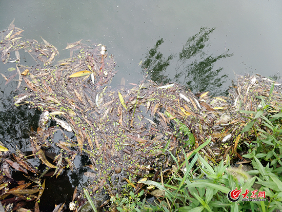 大眾網濟南7月26日訊 26日上午,在濟南大學附近的甲子湖,記者看到,翻著白肚的死魚漂在水面上,順著水流在湖的下游聚集成片。在甲子湖岸邊,也能看見大量死魚掩在水面的落葉中,明顯能聞到一陣陣死魚的腐臭味。記者發現,在甲子湖河道源頭向東20米左右,有兩個直徑約半米的水泥排污孔,污水不斷流入甲子湖中,導致上游四百多米的河道河水顏色發黑,與種有綠植的水域形成色差。