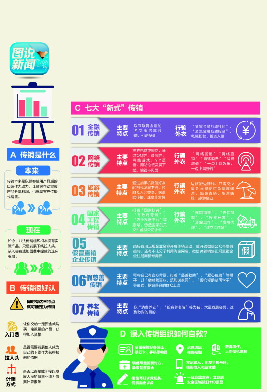 目前我省棗莊、東營、泰安、日照、萊蕪、濟南、青島、淄博、煙臺、濰坊、濟寧、臨沂、濱州、菏澤14市已被認定為無傳銷城市,占全省城市數量的82%。實際上,形形色色的傳銷騙局已盛行多年,屢禁不絕,近年來更借助社交網絡出現了多個“變種”。當前傳銷主要有哪些形式?如何識別傳銷?誤入傳銷組織如何自救?半島逐一進行了梳理。