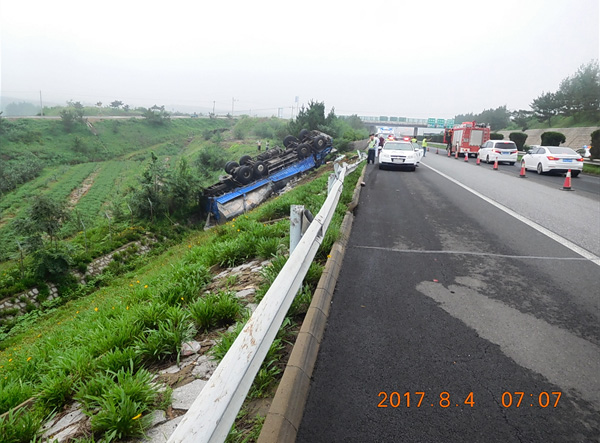 8月4日06時(shí)40分,一輛遼FLXXX牌照的中型普通貨車,沿沈海高速由北向南行駛至475公里+300米處(煙臺(tái)方向)施工路段處,因車速過快,車輛失控側(cè)翻下路基,事故造成駕駛員當(dāng)場死亡,同車一人受傷,車輛和路政設(shè)施受損。