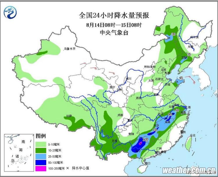 中央氣象臺8月13日18時繼續(xù)發(fā)布暴雨藍色預警:預計8月13日20時至14日20時,貴州南部、廣西北部、湖南西南部和東北部、江西北部、安徽西南部以及山東半島等地有大到暴雨,其中,廣西北部、湖南西南部和東北部、江西西北部等地局地有大暴雨(100~160毫米);上述大部地區(qū)有短時強降水,最大小時雨強可達50~70毫米,局地還將伴有雷暴大風等強對流天氣。