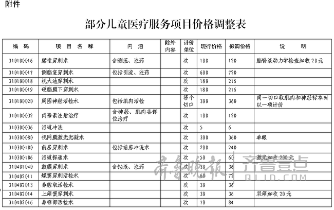 記者從煙臺市物價部門了解到,根據(jù)《關(guān)于印發(fā)〈貫徹國衛(wèi)醫(yī)發(fā)〔2016〕21號文件加強(qiáng)兒童醫(yī)療衛(wèi)生服務(wù)改革與發(fā)展工作方案〉的通知》(魯衛(wèi)醫(yī)字〔2016〕31號)的要求,煙臺市調(diào)整部分兒童醫(yī)療服務(wù)價格。6歲(含)以下兒童手術(shù)價格,在現(xiàn)行價格基礎(chǔ)上提高20%。6歲(含)以下兒童一般治療操作、有創(chuàng)活檢、探查等項目價格,在現(xiàn)行價格基礎(chǔ)上加收20%。