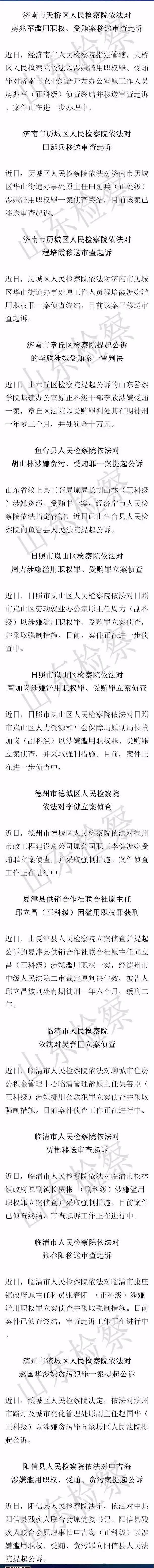 大眾網8月19日訊 記者從山東省人民檢察院獲悉,近日,濟南、濟寧、日照、德州、聊城、濱州等地14人涉嫌職務犯罪被依法追究。