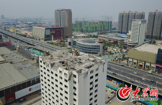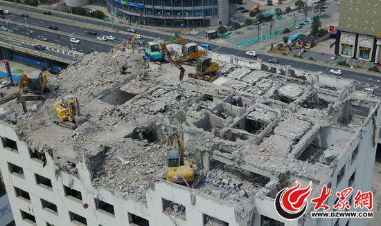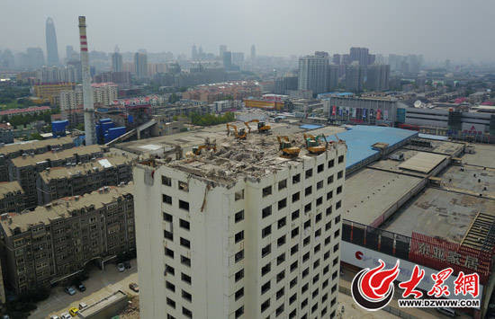 大眾網(wǎng)濟(jì)南8月22日訊 近日,濟(jì)南曾經(jīng)的標(biāo)志性建筑,當(dāng)年興盛一時(shí)的明湖大酒店開(kāi)始拆除。今天中午,大眾網(wǎng)記者通過(guò)無(wú)人機(jī)航拍視頻記錄了拆除現(xiàn)場(chǎng)的情況。為減少對(duì)周?chē)ㄖ案呒軜虻挠绊懀┕し經(jīng)]有用爆破手段拆除,而是用6臺(tái)挖掘機(jī)從樓頂逐層往下拆除。現(xiàn)場(chǎng)工人介紹說(shuō),大約兩周后將進(jìn)入第二階段施工,對(duì)承重墻進(jìn)行機(jī)械破拆使樓體單側(cè)傾倒。