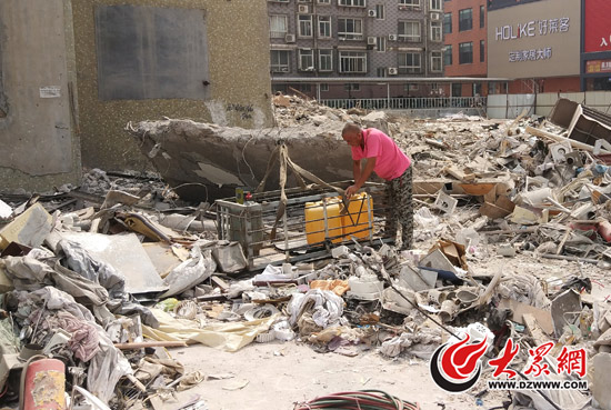 院子西側(cè)滿(mǎn)是從樓頂拆落的鋼筋混凝土,挖掘機(jī)油料和氣割用的氧氣都用滑輪吊運(yùn)