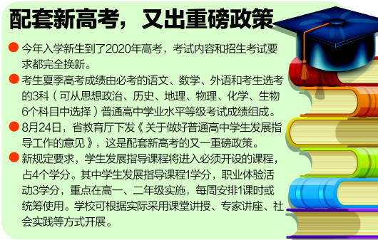 今年秋季入學的高一新生將完全適用新高考政策。面對完全換新的高考政策,普高的課程如何改革?學生如何面對新高考?成為重中之重的內(nèi)容。8月24日,省教育廳下發(fā)《關(guān)于做好普通高中學生發(fā)展指導工作的意見》,這是配套新高考的又一重磅政策。山東新高考將實行語數(shù)外必考,其余六門選考的形式,文理分科取消后更考驗學生對于自己興趣特長以及未來發(fā)展的選擇和定位。新規(guī)定要求,學生發(fā)展指導課程將進入必須開設(shè)的課程,占4個學分。