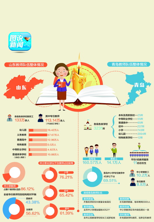 半島都市報9月9日訊 教育大計,教師為本,第33個教師節來了,全社會掀起了尊師重教的熱潮。實際上,我們平時關注教師帶來的教育進步,育人爭先的成果,而你我真的了解教師隊伍嗎?9月9日,記者多方采訪整理,通過大數據的形式,帶您認識咱們青島的教師隊伍現狀。