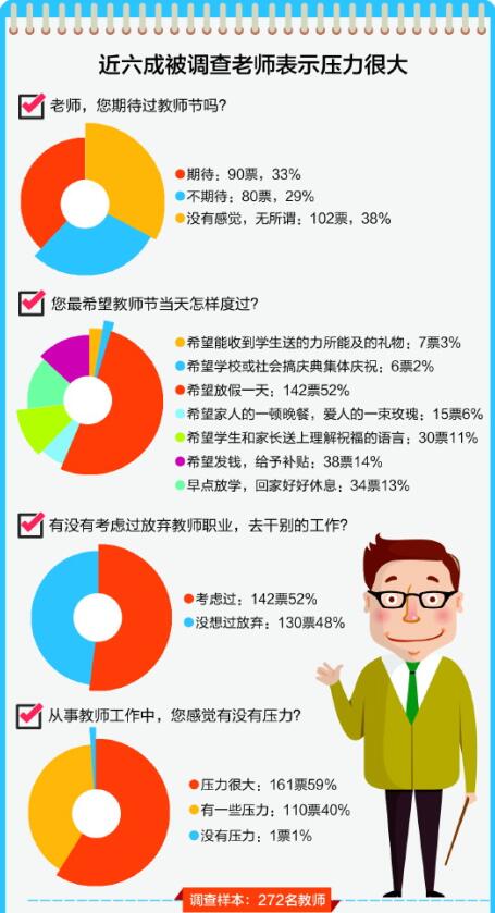 與考教師的熱情高漲對比,當了教師之后的職業認同感和職業幸福感如何?記者日前針對教師群體發起了一項問卷調查,截至9月10日下午6時,共有272名教師參加了調查。有206名教師表示,自己當教師之前滿懷憧憬,而當了教師之后卻感覺很疲憊,職業幸福感有所下降,占比達到76%。甚至有過半的老師想過放棄教師職業。促使教師熱情遇冷的原因是多方面的,教師所面對的工作壓力大是其中之一。在調查中,有59%的教師感覺自己在從事教師工作中,壓力很大。