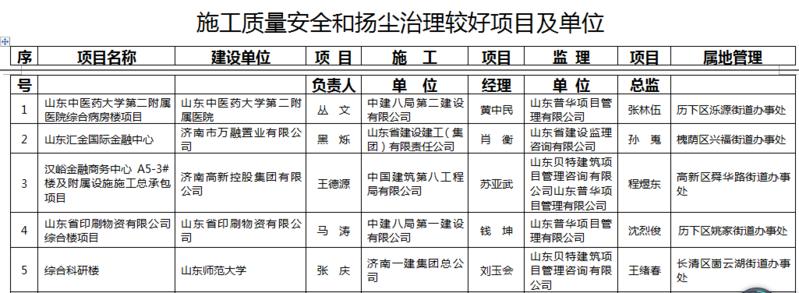 其中,對6、7月份質量安全管理和揚塵治理措施落實較好的山東中醫藥大學第二附屬醫院綜合病房樓項目等20個項目的參建單位和屬地管理部門,予以全市通報表揚,納入誠信評價體系。